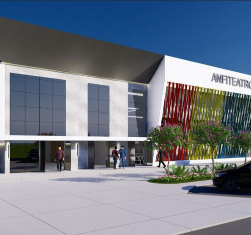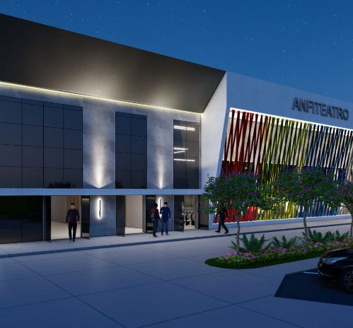 Projeto arquitetônico cultural com identidade marcante e forte presença urbana. A fachada contemporânea incorpora elementos verticais coloridos que reforçam o caráter artístico do espaço.